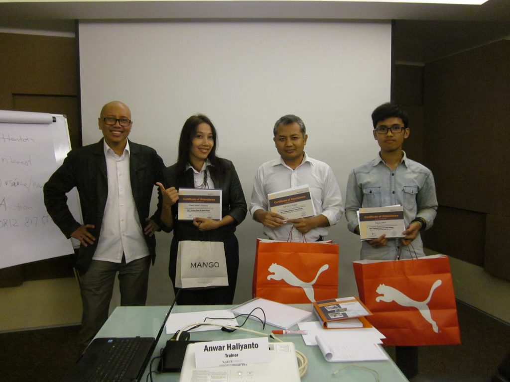 Pelatihan The 7 Selling Steps for Sales People yang diselenggarakan pada tanggal 13-14 April 2016 di Intercontinental MID Plaza Hotel – Jakarta. Pelatihan The 7 Selling Steps for Sales People di sampaikan oleh Widijatmoko Trainer yang sudah sangat berpengalaman. Pelatihan The 7 Selling Steps for Sales People membahas : A. Bagaimana Membangun Self Confidence Hambatan seseorang menjadi tidak percaya diri Apa fondasi rasa percaya diri dan bagiamana keluar dari belenggu keminderan? Berbicara dengan percaya diri Tujuan sesi ini : Melatih partisipan untuk membangun rasa percaya diri dan membangun keyakinan untuk menyakinkan orang lain B. Bangga sebagai seorang Sales Force Alasan orang tidak suka menjadi seorang penjual Beda penjual yang sukses dan penjual yang gagal Kisah sukses beberapa penjual yang berhasil Tujuan sesi ini : Menumbuhkan kebanggaan sebagai seorang penjual dan mampu menemukan kunci keberhasilan seorang penjual serta akhirnya mempunyai kesenangan menjual C. Research, Analysis dan Planning Skills Mengumpulkan data, menilai calon customer dan mendapatkan informasi Mengadakan riset pasar Menyiapkan product knowledge tools yang relevan di setiap rencana kunjungan Tujuan sesi ini : Peserta akan mempunyai kemampuan dalam perencanaan kunjungan yang meliputi rute, objektif dan lain-lain serta mengumpulkan bahan-bahan pendukung secara efisien. D. Opening, Listening dan Questioning Skills Keterampilan di dalam membuka kunjungan dan membangun hubungan awal Menyampaikan tujuan atau agenda kunjungan Mengidentifikasi dan memahami kebutuhan customer Tujuan sesi ini : Peserta di harapkan mempunyai keterampila cara membuka kunjungan, mendengar yang aktif, membuat pertanyaan dengan benar, tidak terlalu banyak bicara dan yang menggali lebih dalam E. Presentation dan Handling Objection Skills Menceritakan produk dalam bahasa yang dipahami oleh customer Memaparkan fitur dan manfaat produk secara konsisten Tujuan sesi ini : Keterampilan yang akan dimiliki peserta di dalam membuat langkah-langkah presentasi dengan menggunakan “Main Idea” yang menggiring ke kebutuhan customer, mampu mengidentifikasi “real problem” dan menjawab dengan solusi yang relevan di dalam menangani keberatan atau penolakan. F. Closing Skills Mengetahui kapan dan bagaiman menutup penjualan Mendengar dan memberikan reaksi terhadap buying signal Tujuan sesi ini : Peserta dapat menyampaikan kesimpulan kunjungan, menyepakati agenda untuk langkah-langkah selanjutnya dan melakukan penutupan sales dengan berbagai tekhnik. G. Follow Up Skills Memastikan eksekusi kesepakatan dan tindakan yang telah disetujui Menindaklanjuti apa yang sudah dijanjikan Berpikir tentang sales tidak berhenti pada saat order Tujuan sesi ini : Peserta tahu dan mampu bagaimana membina hubungan jangka panjang, membuat evaluasi kunjungan, menentukan kunjungan yang akan datang, dan mampu mengidentifikasi peluangyang ada Metode Pelatihan Sharing Metode pengajaran yang mengutamakan partisipasi peserta di dalam program pelatihan sehingga menciptakan komunikasi dan interaksi dua arah di dalam kelas. Case Study Pembahasan kasus-kasus real yang terjadi di lapangan guna meningkatkan pemahaman pengaplikasian teori dan konsep di lapangan. Role Play with sales scripts Sebagai bentuk aktifitas yang dirancang guna meningkatkan pemahaman pengaplikasian ilmu dengan menggunakan skenario yang mendekati kondisi di lapangan. Games Bentuk aktifitas yang di tujukan untuk penghayatan terhadap materi-materi pembelajaran yang ada. Job Assignment – Action Plan (optional) Pelaksanaan tugas/pekerjaan yang dilakukan berhubungan dengan kegiatan realisasi di lapangan dan dihubungkan dengan kegiatan pelatihan di dalam kelas. [ngg src=”galleries” ids=”13″ display=”basic_thumbnail”]